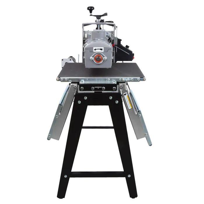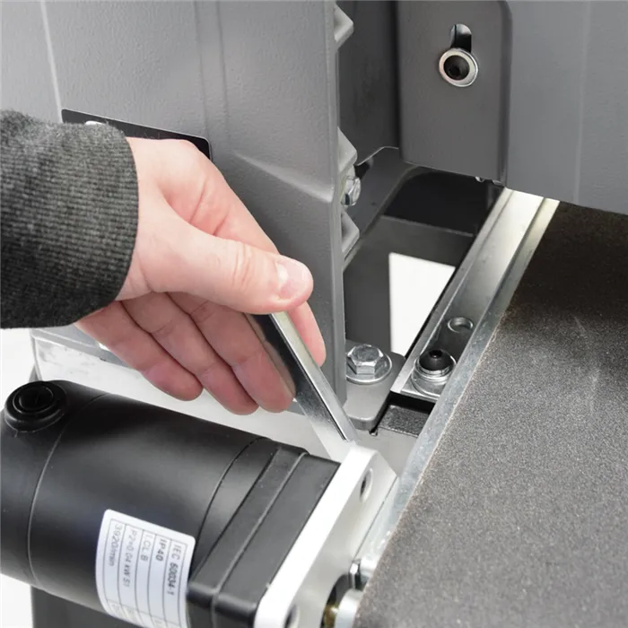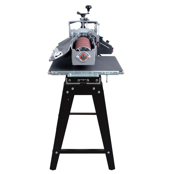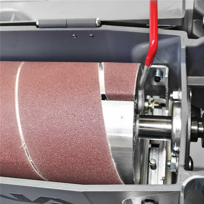 Přesnost podél šířky celého dílce je zaručena nejen tuhou litinovou konstrukcí, ale také přesným paralelním srovnáním mezi válcem a posuvným pásem. Bruska je vybavená pákou pro rychlé přenastavení, kterou využijete při broušení širokých dílců. Páka lehce přizvedne posuvný stůl, čímž zamezí vzniku rýh na části dílce přesahující přes válec. Samostatný motor pásu posuvu je umístěn na zadní straně brusky a pás je tak spíše tažen, než tlačen.