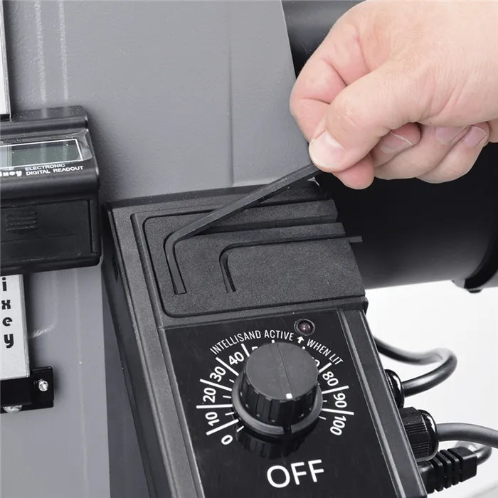 Jednou z těchto výhod je páka pro snadné nastavení výšky broušení. Změnu výšky provedete během pár vteřin bez nutnosti zdlouhavě točit kolem, jak tomu bývá u klasických brusek. Po přenastavení výšky broušení páku přepnete do polohy mikro úpravy a točením nastavíte přesný úběr pomocí digitálního displeje. Vestavěný displej zobrazuje výšku válce v desetinách milimetru a umožňuje tak přesně odečíst hodnotu.